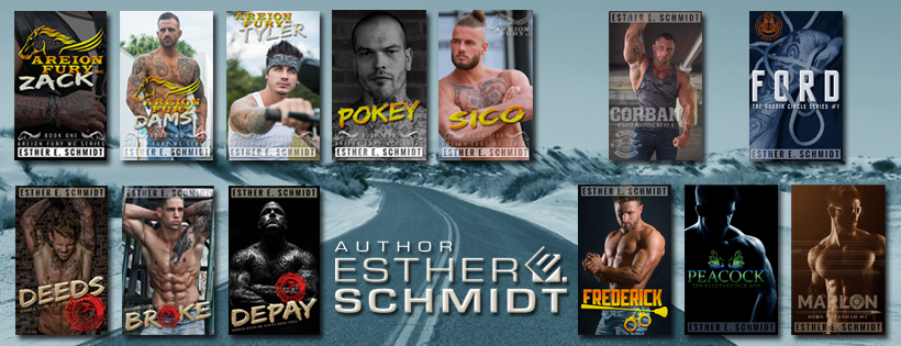 Esther E. Schmidt, author of Areion Fury MC, Broken Deeds MC, The Dudnik Circle series, and The Swamp Heads series. She’s a graphic designer that also loves to write. She released her first series “Areion Fury MC” in October 2015. Esther lives in The Netherlands with her family, three daughters, a crazy bulldog and four rats. She loves to write erotic Romance about bad boy Alphas with a heart for only one woman. To make it a bit interesting, that woman needs to be a badass herself. She loves to work out and most of her story lines come from doing cardio.
