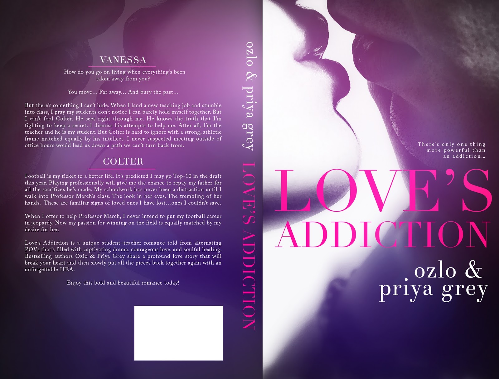 Love’s Addiction is a unique student-teacher romance told from alternating points of view. It’s filled with captivating drama, courageous love, and soulful healing. Best-selling authors Ozlo and Priya Grey share a profound love story that will break your heart. Then they slowly put all the pieces back together again with an unforgettable happily ever after.